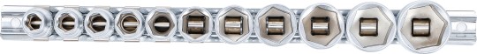 - Dugókulcsbetét, 10 mm (3/8"), hatszögletű: Kulcsnyílás: 5/16" - 11/32" - 3/8" - 7/16" - 1/2" - 9/16" - 5/8- 11/16" - 3/4" - 13/16" - 7/8"