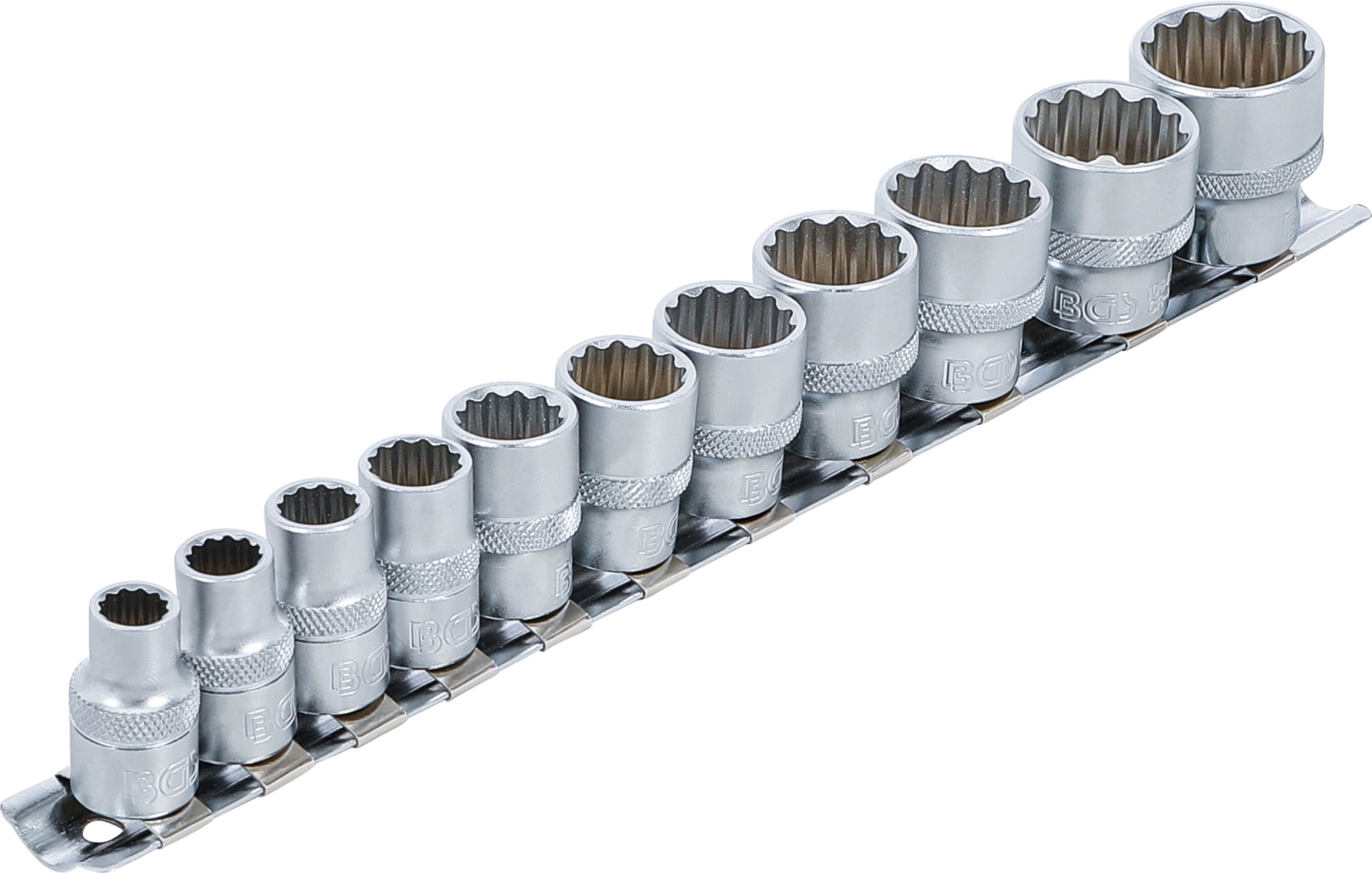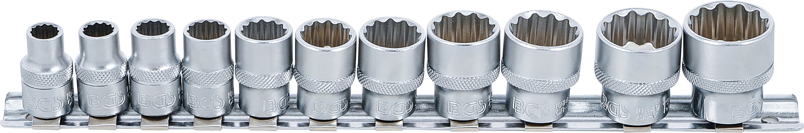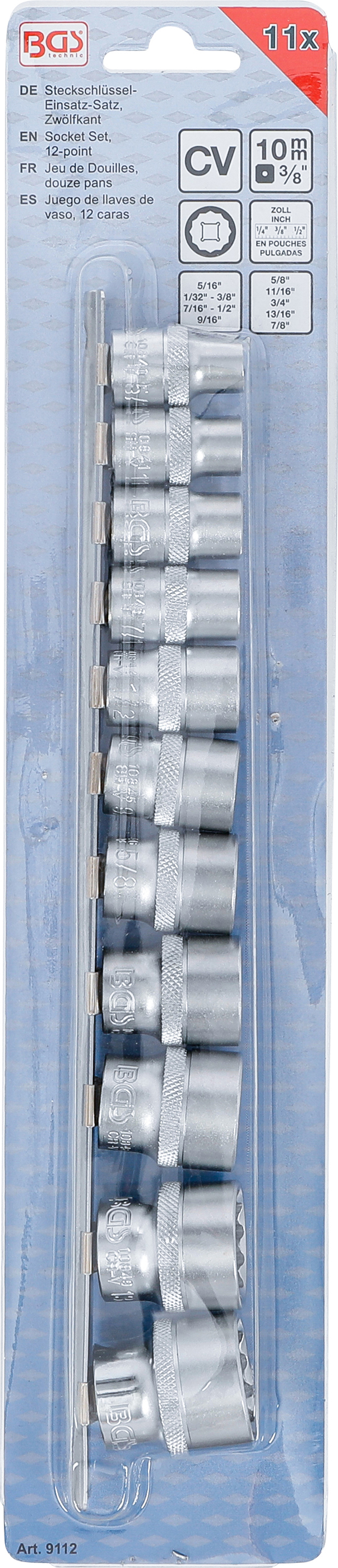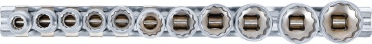 - Dugókulcsbetétek, 10 mm (3/8"), tizenkétszögletű: Kulcsnyílás: 5/16" - 11/32" - 3/8" - 7/16" - 1/2" - 9/16" - 5/8" - 11/16" - 3/4" - 13/16" - 7/8"
