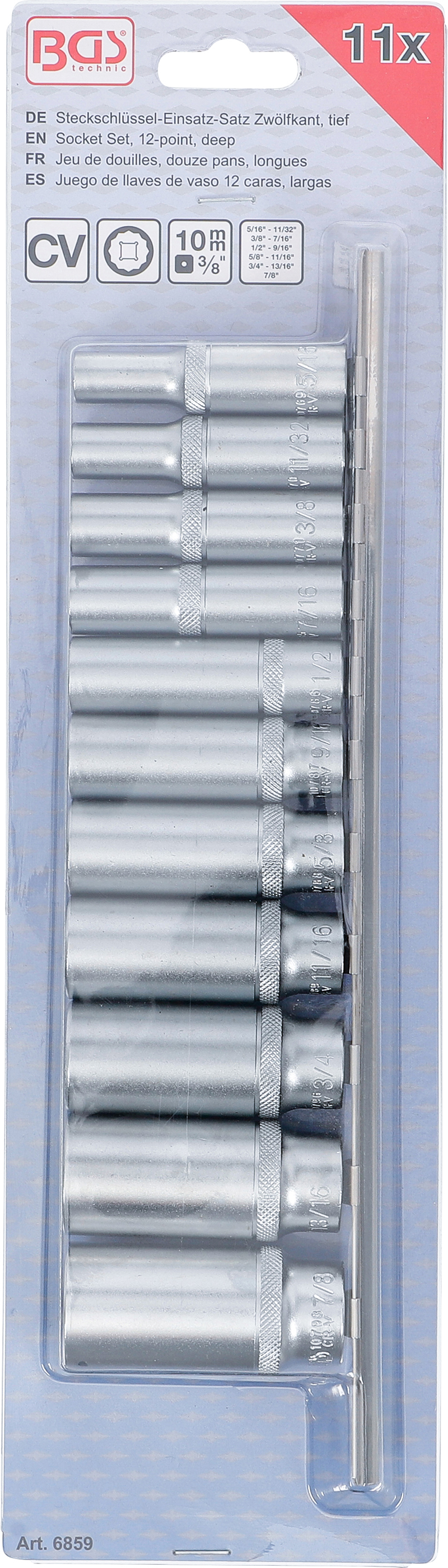 Dugókulcskészlet, tizenkétszögletű, mély | 10 mm (3/8") | coll méretek | 11 darabos