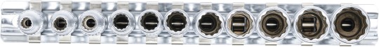 - Dugókulcsbetétek, tizenkétszögletű, 6,3 mm (1/4"): Kulcsnyílás: 4 - 5 - 5,5 - 6 - 7 - 8 - 9 - 10 - 11 - 12 - 13 mm
