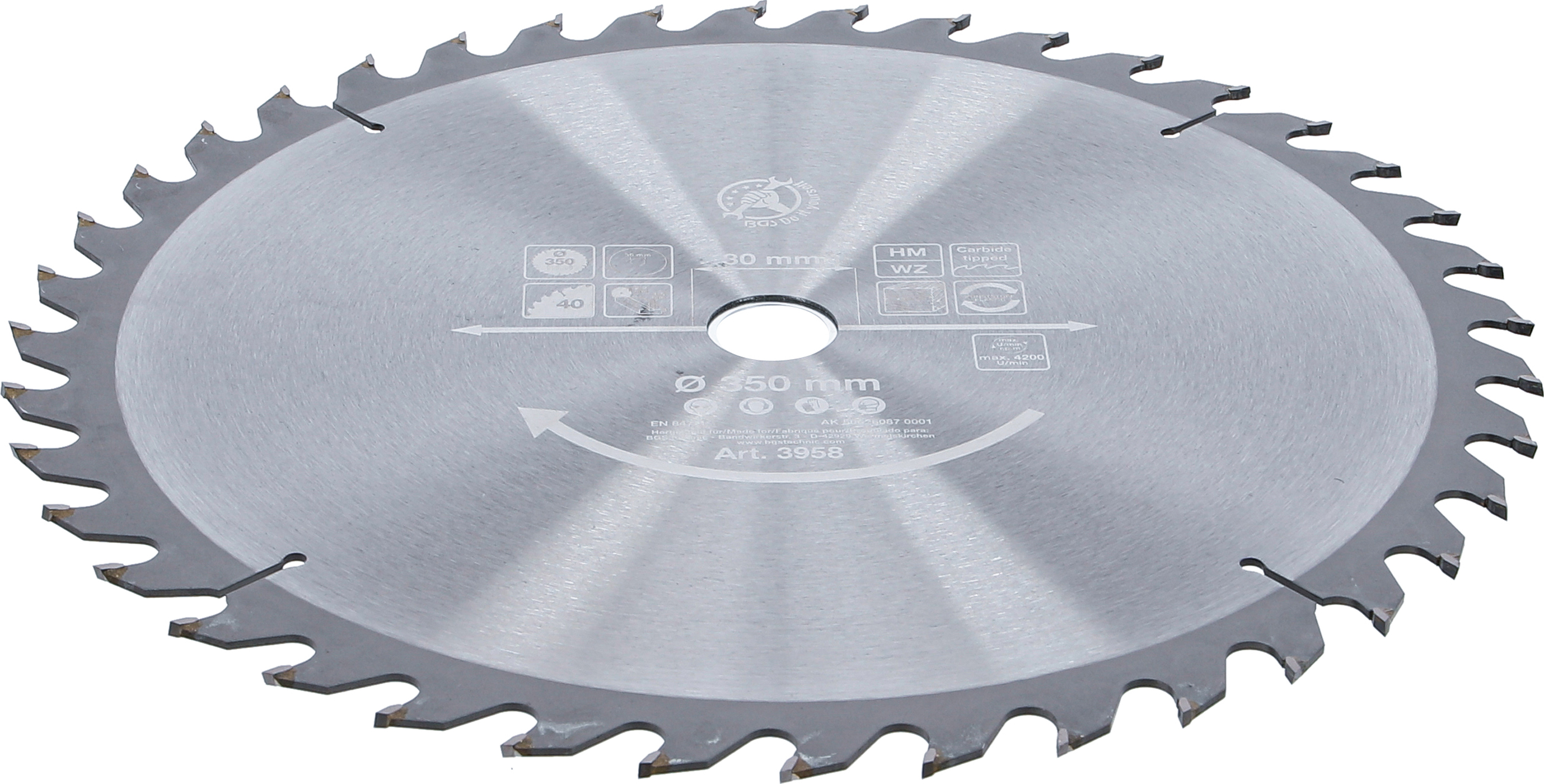 Furatátmérő: 30 mm Bruttó súly: 1644 g Fordulatszám max.: 4300 Ford/min Átmérő: 350 mm Vágásszélesség: 3,4 mm Erősség: 2,2 mm Fogak: 40