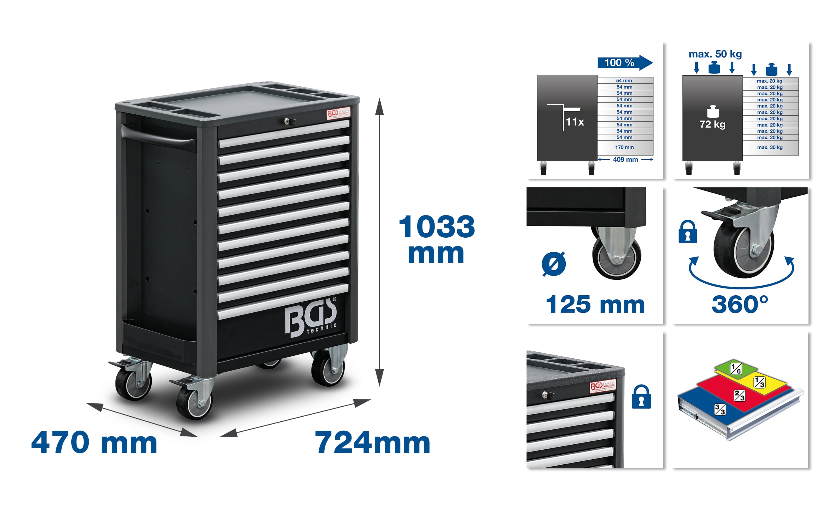 Fiókok száma: 11 Darab Szélesség: 724 mm Bruttó súly: 85800 g Magasság: 1033 mm Hossz: 470 mm Fióksín: 100 % Fiókszélesség: 569 mm Fiókmagasság: 10 x 54 | 1 x 170 mm Fiókmélység: 409 mm