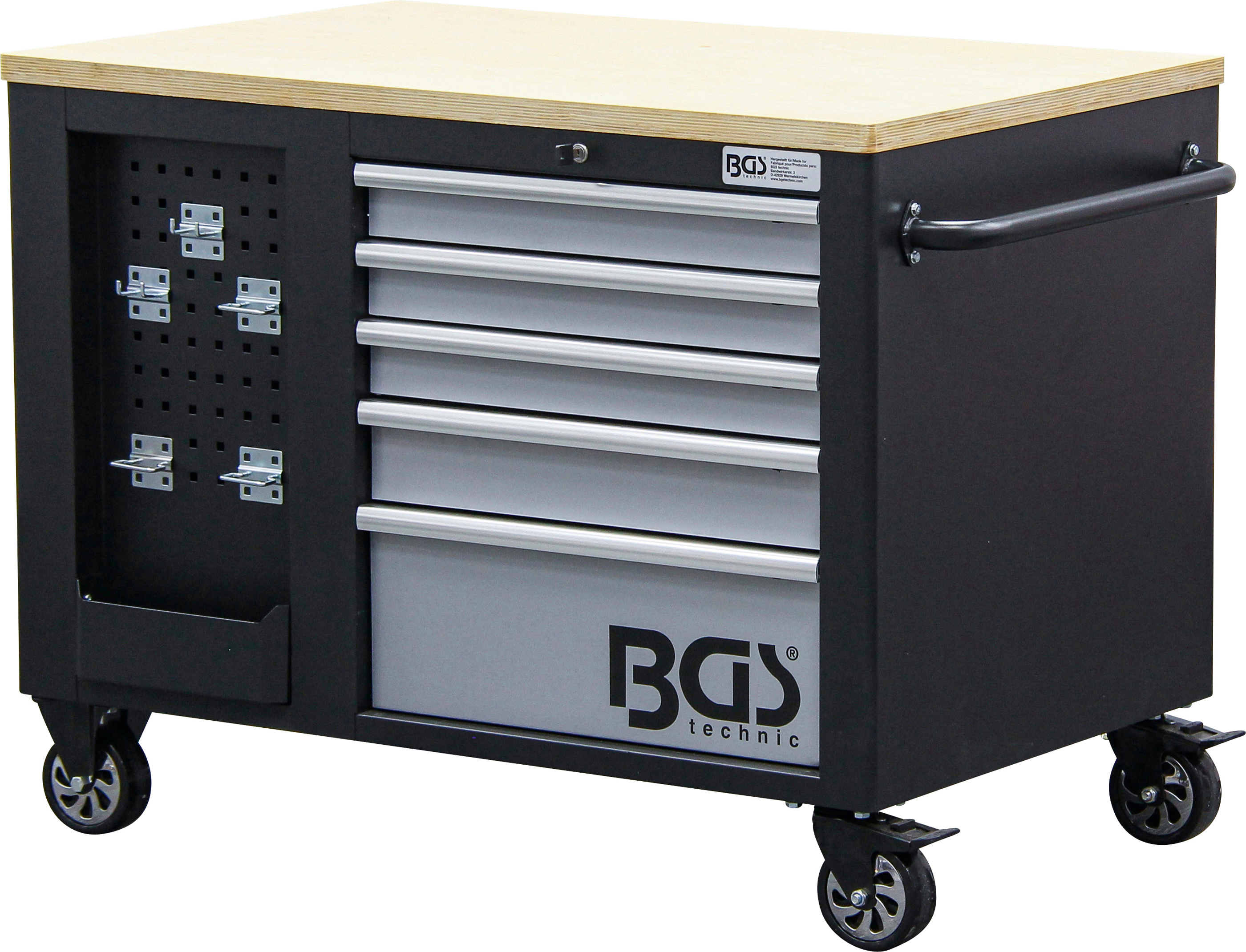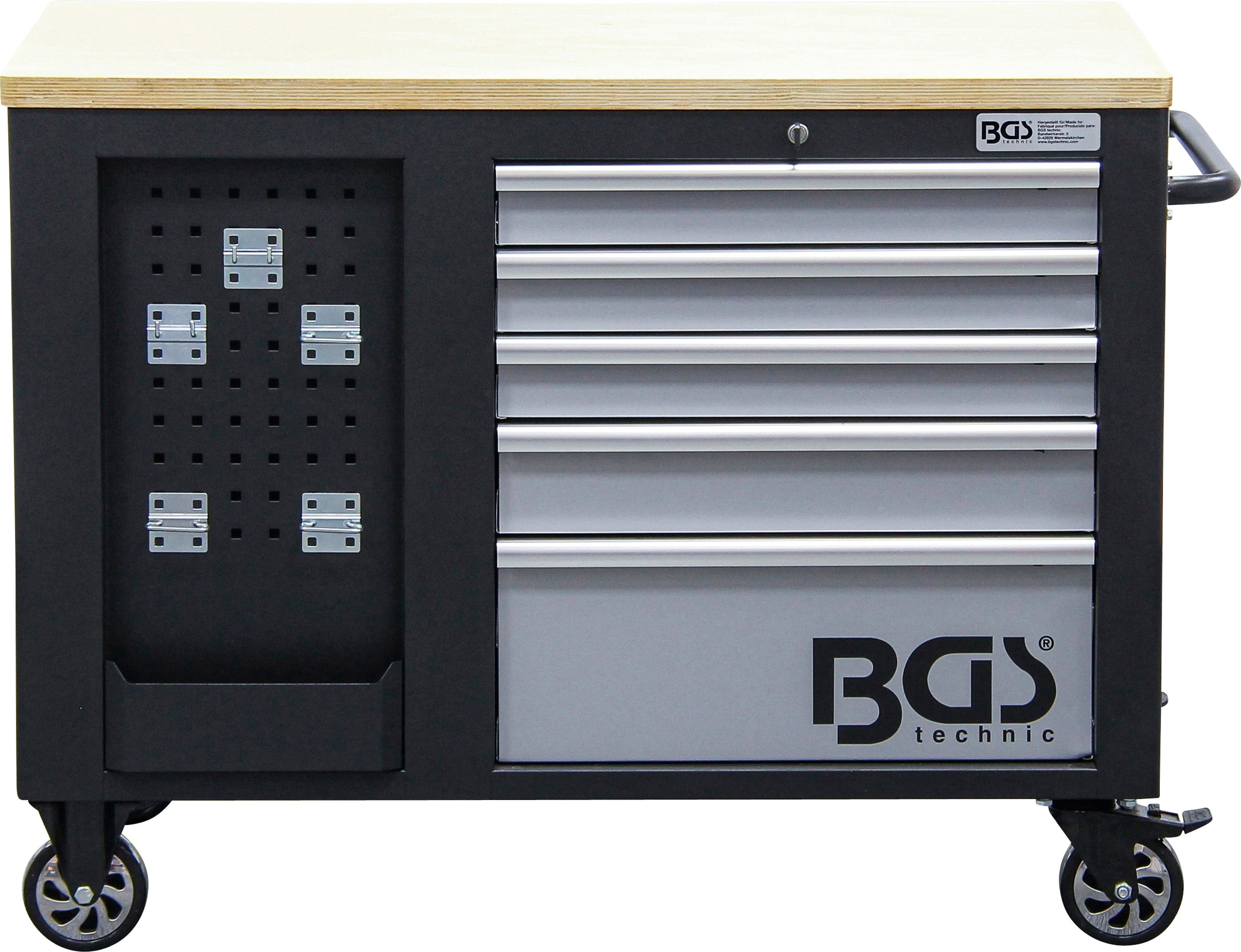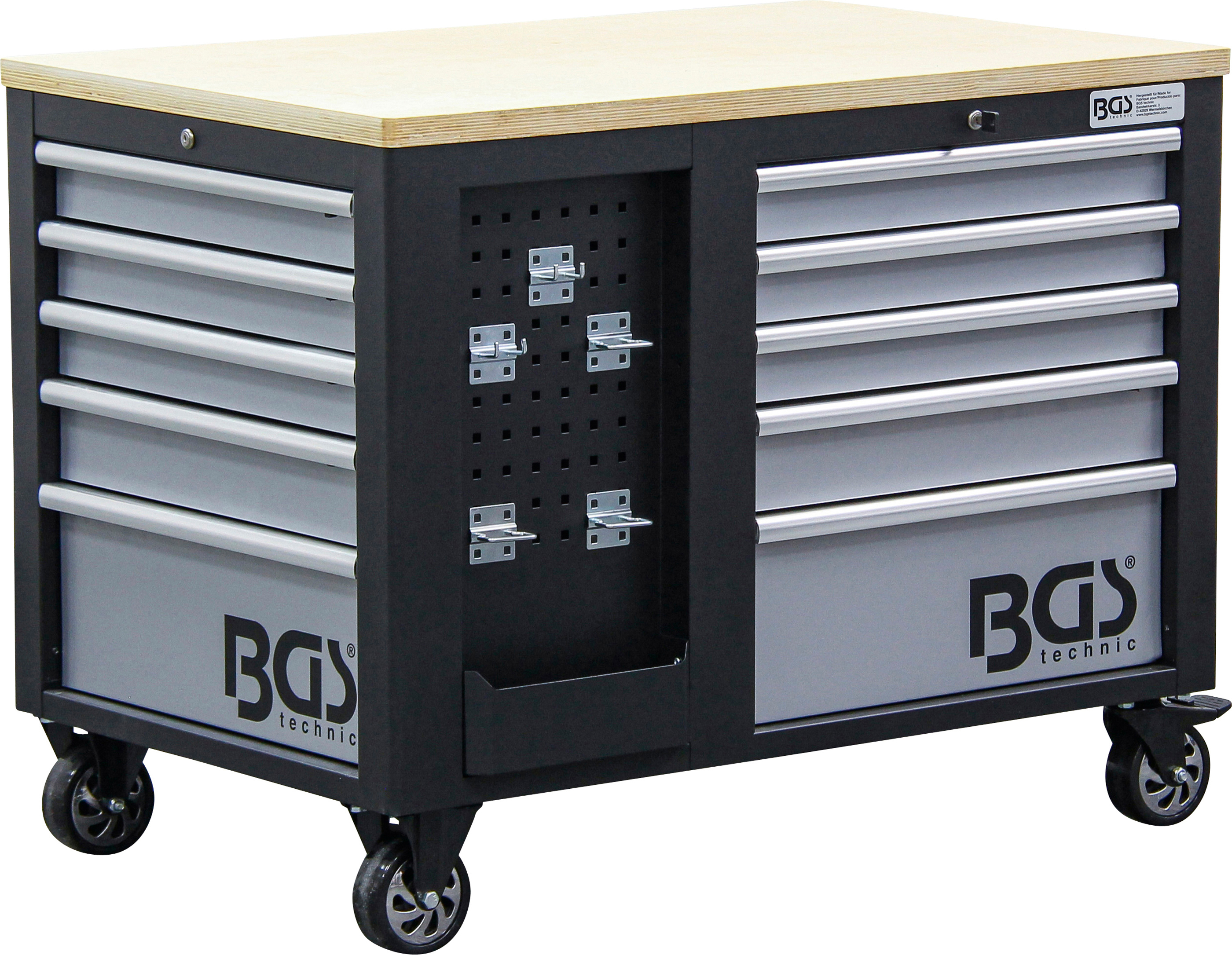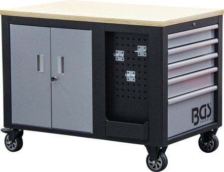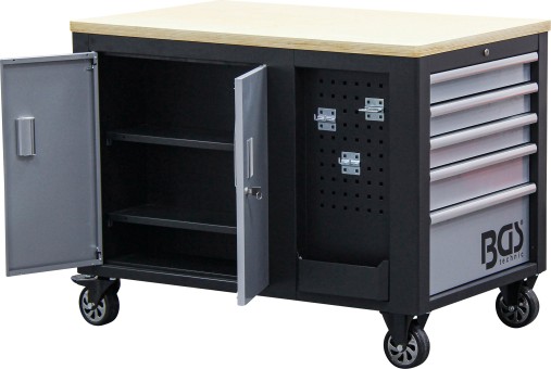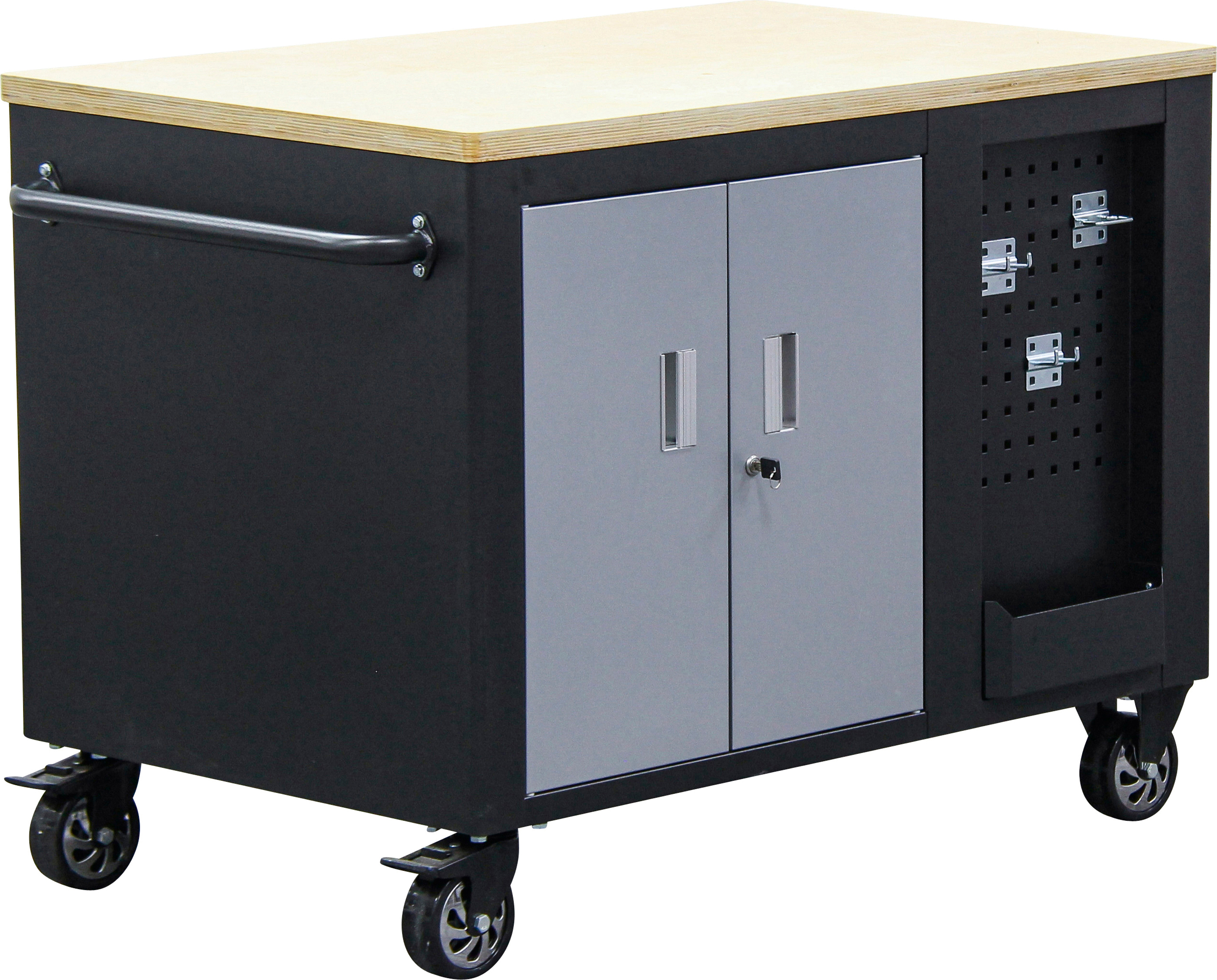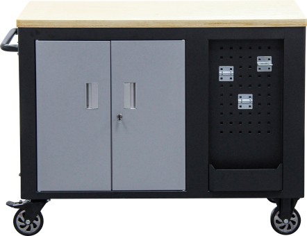 - 2 tárolórekesz felettük elhelyezkedő lyukas lemezes fallal szerszámok és más hasznos eszközök ráakasztásához, horogkészlettel együtt